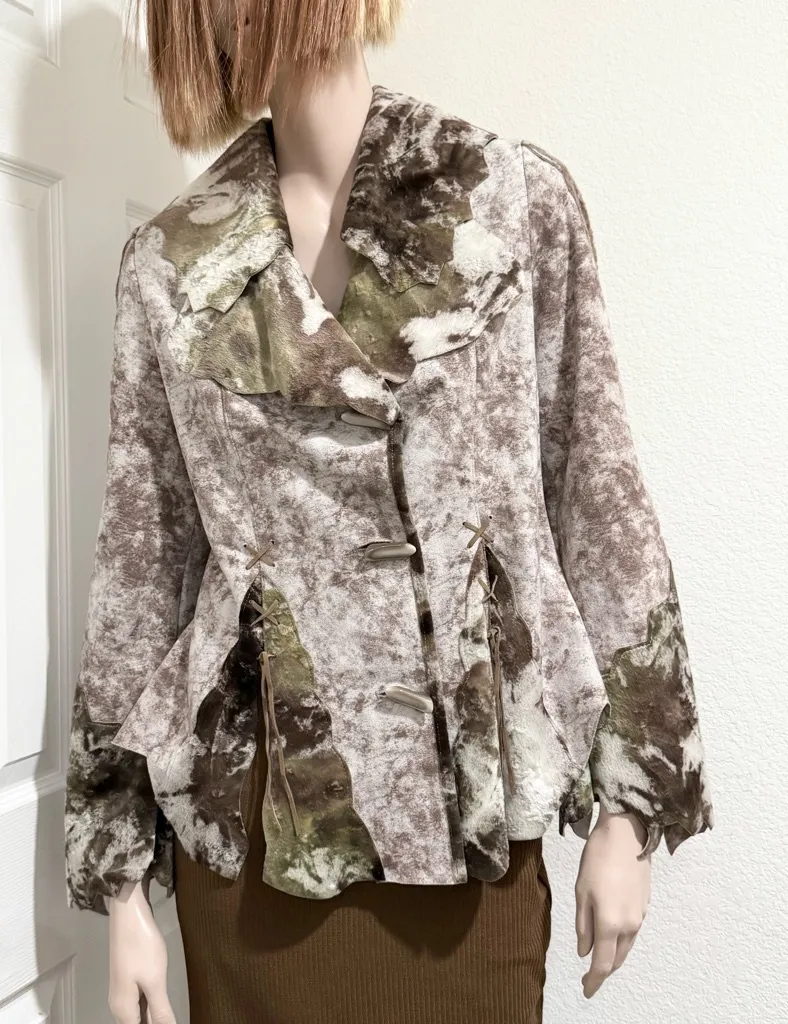 Size 40 US10. Pre-owned with normal wear from use consistent to age, overall in great vintage condition. Features 3-button front closure, leather lace up detail, flare sleeves & wide collar. Please refer to the photos for details and measurements. You will receive exactly as pictured! Measurements (laying flat): Shoulder: 15.5” Sleeves: 26” Pit to pit: 20” Length: 28” Feel free to ask any questions. All sales are final. No returns. Thank you for considering our listing. Disclaimer: Due to the unique nature of vintage items, imperfections and flaws are normal and consistent with age, use, and display. Cleaning and polishing are the buyer’s responsibility, and I leave the item “As Is!” The provided photos are actual images of the item. Zoom in on the photos for closer details.