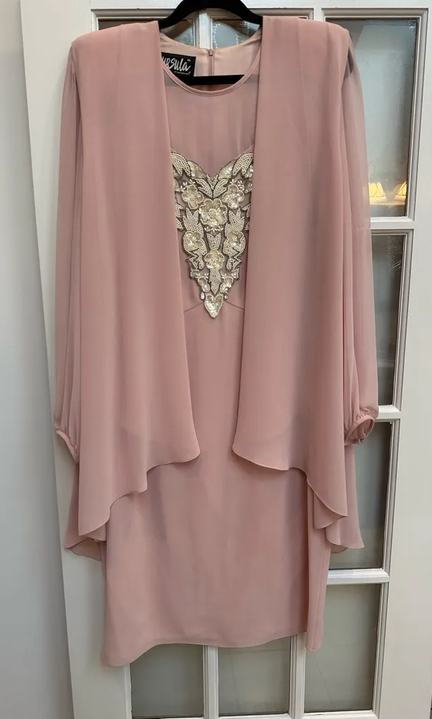 This elegant pink chiffon dress features a beautiful embellished detail on the front. Perfect for special occasions, it offers a sophisticated and stylish look. Excellent preowned condition, no found flaws Smoke free home