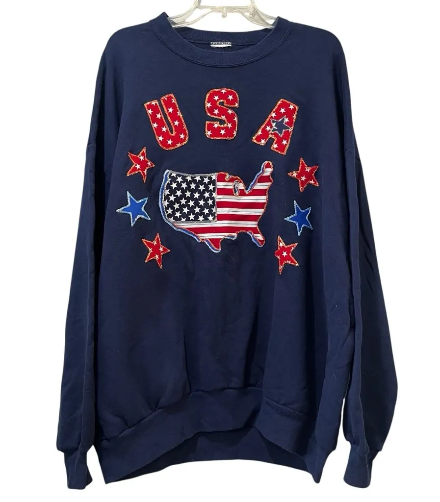 Missing size tag. Please read sizing description. Underarm to underarm = 27” Length = 32” Arm length = 27” This vintage USA Navy Blue sweatshirt in size 3XL features puff paint stars and a map, perfect for celebrating the 4th of July. The pullover sweatshirt is designed for unisex adults and showcases a classic blue color with a patriotic USA theme. Made with quality materials, this sweatshirt is a stylish and comfortable option for those looking to show off their American pride.