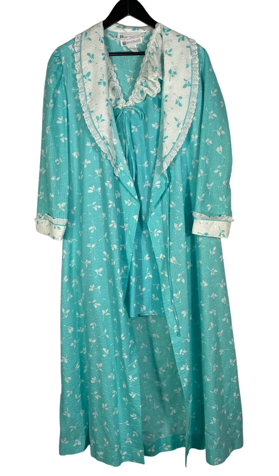 Charming vintage Vandemere sleepwear set featuring a sheer aqua blue floral print with lace-trimmed... Show more