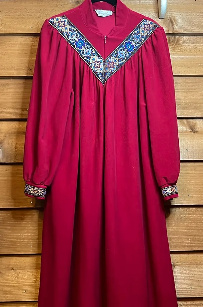 Brand: Vanity Fair Description: vintage embroidered house coat with pockets. Full zip front! made in the USA! feels like velvet. Flawless! Measurements taken with the item laying flat Size: M P2P: 21.25” Thanks for checking out my closet! Tags: Christmas, vintage, duster, holiday, housecoat, cottagecore, grannycore, gorpcore, embroidered, 60s, 70s, 80s, 90s, boho, hippie, Aztec, floral, gold H8