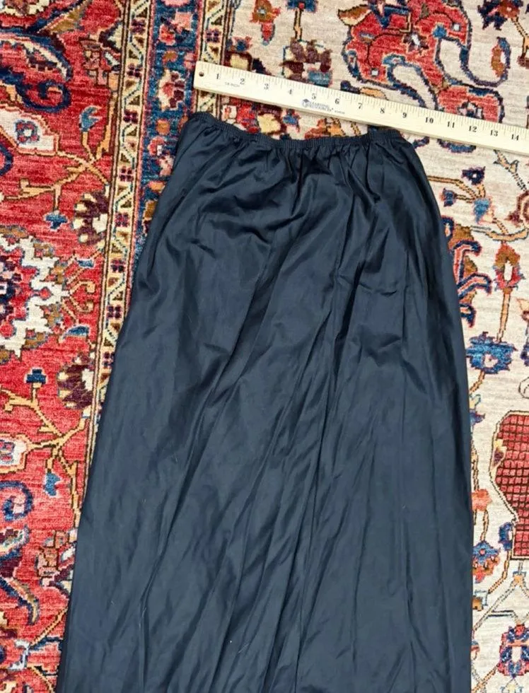 Brand: Vanity Fair Style: Half slip skirt Color: Black Material: 100% nylon Size: S/M — waist 24–26 (per tag) Features: Elastic waistband, lightweight nylon fabric, sheer lace hem, midi/long length, perfect for layering, vintage lingerie Condition: Excellent vintage condition; light wrinkles from storage. No major flaws noted. Note- Rn is Vanity Fair