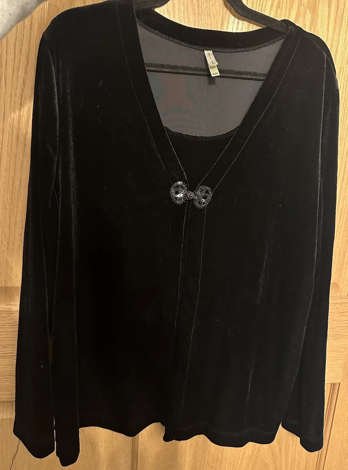 This Vintage Velvet Black Cardigan Top with Gemstone Accent by WhiteStag is a stylish and versatile... Show more