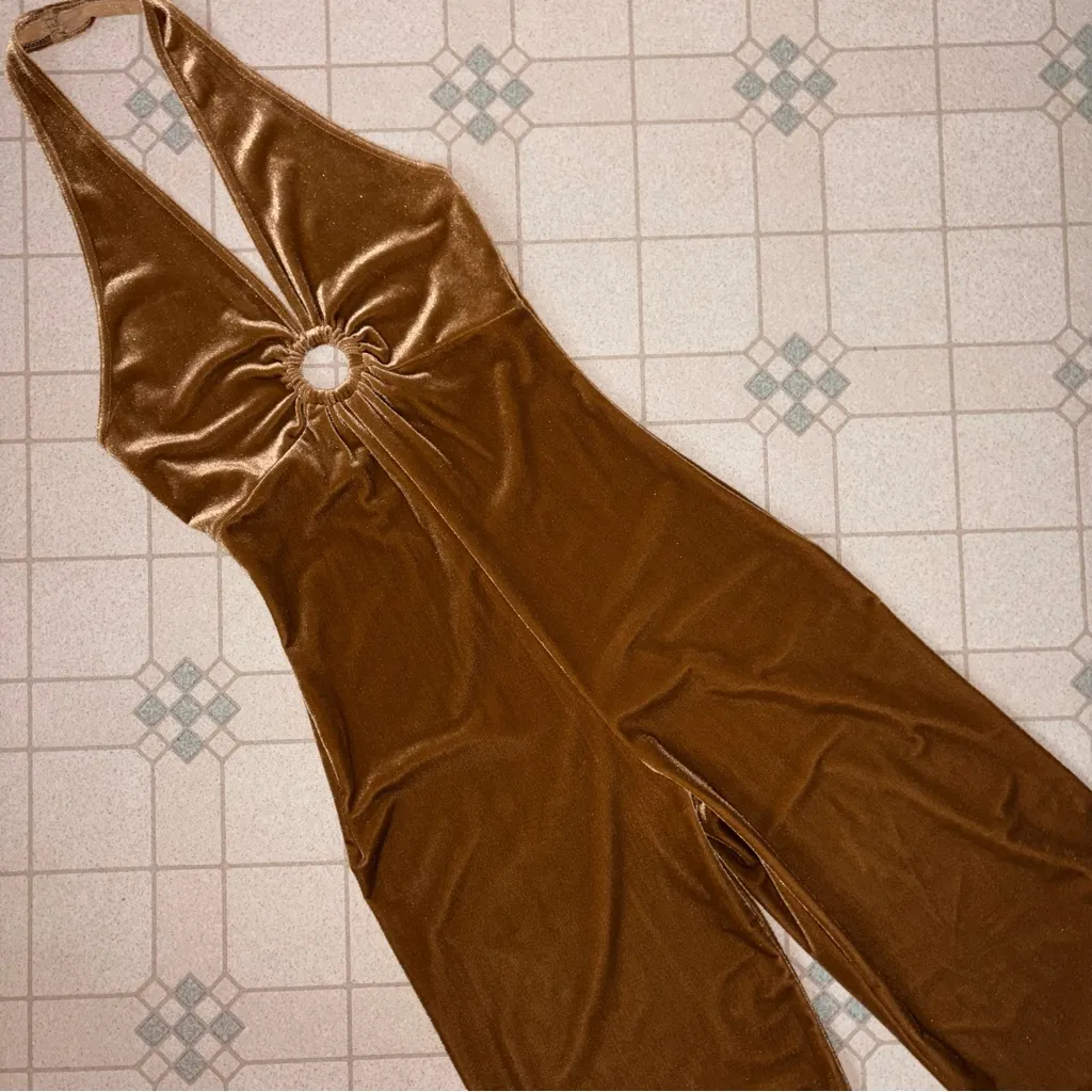 Flat measurements Waist: 12 inches Rise: 29 inches Inseam: 32 inches Vintage Velvet Halter Neck Wide Leg Pants Jumpsuit Women Size M Babydoll Retro Features - halter top with v neckline - o ring detail at the chest - babydoll silhouette - wide leg pants - open back - all over caramel golden velvet Excellent pre-owned condition Comment questions, I'm happy to help. All items are steam cleaned Check out my closet! Bundle & save Elevate your wardrobe with this chic tan halter jumpsuit. Its stylish design ensures you stand out at any event. Maximalism retro gogo 70s whimsical whimsigoth fairy earthy dark fairy neutral event party statement piece dopamine dressing fall winter spring transitional weather evening copper gold camel sexy
