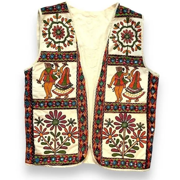 Vintage Vest Charming folk art embroidered topper Shades of red green plum orange burgundy and black pop against an off white background Ethnic dancers Floral designs with reflective mirrored elements Interior pocket Seam separation by left shoulder Stain and piling on back Fit is close to a modern large or XL see measurements Flat lay measurements 23 inches pit to pit 25 inch length Thank you for shopping sustainably with this preloved item A unique piece of art to wear Such a versatile closet staple Wear to school festival or weekend craft shows Perfect for a folksy Craftcore bohemian artsy aesthetic