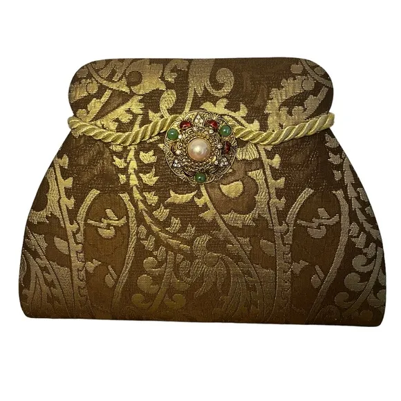 NWOT 11.5”W x 8.5”H Gold Rope Shoulder Strap Inside has one slit pocket Snap closure Photo... Show more