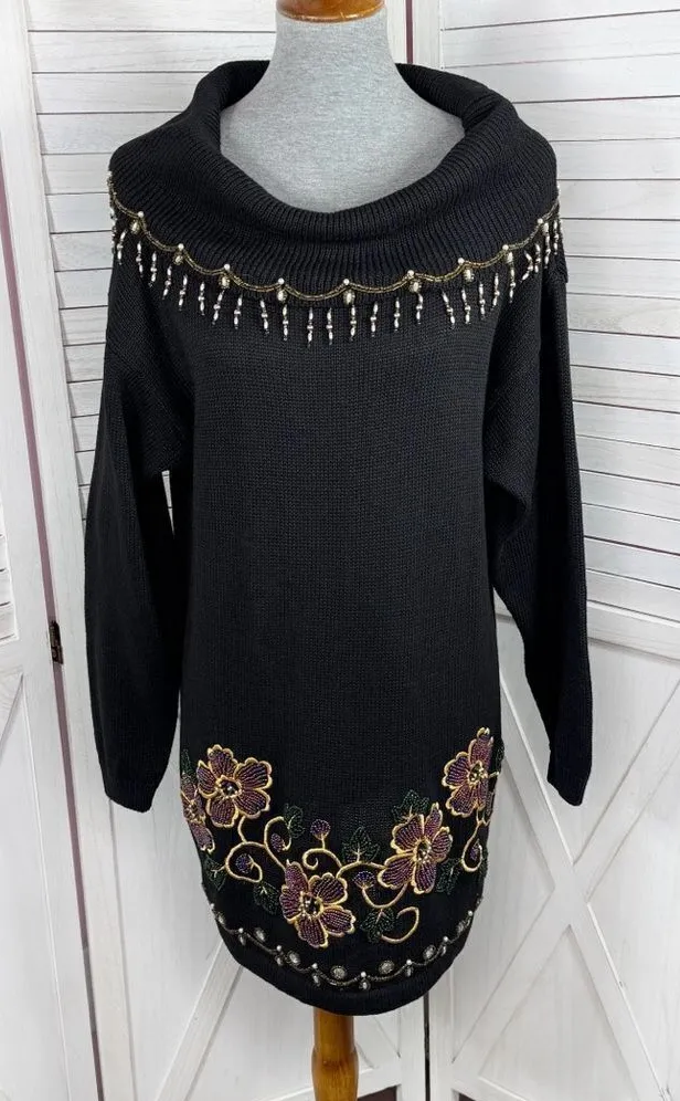 Vintage Victoria Jones 90s Floral Beaded Cowl Neck Tunic Sweater Black Size Medium Dark black ra... Show more