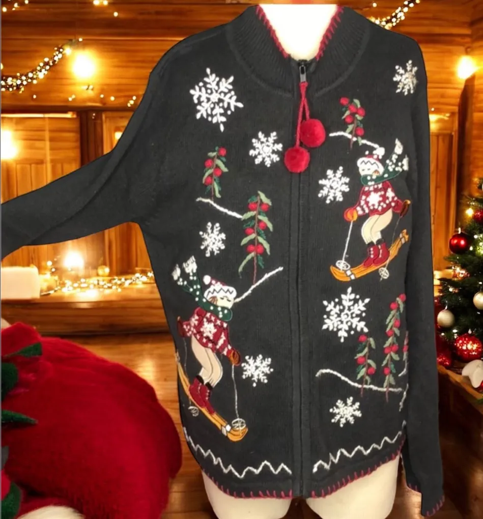 Festive & Fun Vintage Christmas Cardigan! Get ready for your next ugly sweater party or cozy winter gathering with this charming and rare vintage holiday cardigan by Victoria Jones. Key Features: • Design: Black full-zip sweater featuring playful embroidered and appliquéd holiday characters. The front is decorated with skiing snowmen/figures, white snowflakes, and red berry branches. • Details: Zip closure with adorable red pom-pom pulls. Red contrast stitching accents the hem and cuffs (visible on the back view). • Brand: Victoria Jones • Style: Ugly Christmas Sweater / Holiday Cardigan / Full-Zip Knit • Size Tag: M Condition: Excellent vintage pre-owned condition. All embellishments are intact. Minimal signs of wear typical of a cherished vintage piece. Fabric Content (from tag): • Body: 55% Ramie / 45% Cotton • Decoration: 35% Acrylic / 20% Ramie / 19% Cotton / 13% Rayon / 6% Nylon / 5% Polyester / 2% Wool / Leather Fiber (Note: This is a complex vintage blend). Approximate Measurements (Taken flat from the images): • Pit to Pit (Width): 21 - 22” inches • Length 24 inches Care: Hand wash or dry clean recommended for vintage knitwear. Ready to ship! • Victoria Jones • Vintage Sweater • Ugly Christmas Sweater • Holiday Cardigan • Christmas Knit • Black Sweater • Skiing Snowman • Snowflake • Embroidered • Applique • Winter Sweater • Full Zip • Pom Pom • 90s Fashion (or 80s if it looks earlier) • Retro Holiday • Ships Fast.