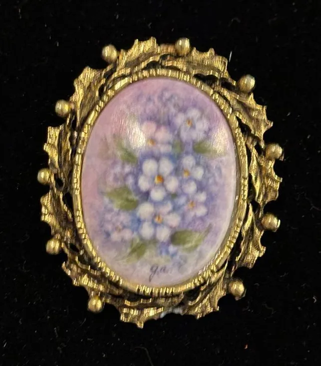 Elegant vintage brooch featuring a delicate floral design in purple, set in a gold tone frame. Perfect for adding a touch of classic charm to any outfit. Has an attached bale so can be a pendant also! Some minor wear to the back of the broach but the front is good! Beautiful brooch for your collection!