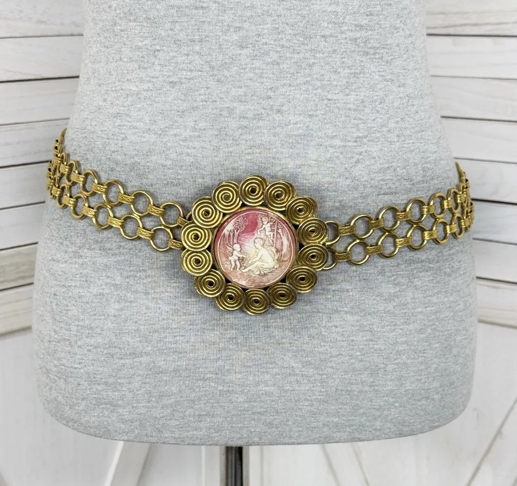 Vintage Victorian Revival Cameo Medallion Carved Resin Chain Belt Gold Pink Gold tone metal Dark rose & ivory medallion Victorian revival lady & cherubs Carved resin Framed in swirled metal Round link chain belt double stack Front hook close 32” long Vintage Victorian Whimsigoth Bewitched Boho Romantic Feminine Cottagecore Romantic Art