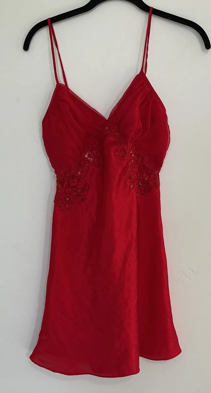 Stunning vintage Victoria's Secret red slip dress featuring sheer chiffon fabric with delicate lace... Show more