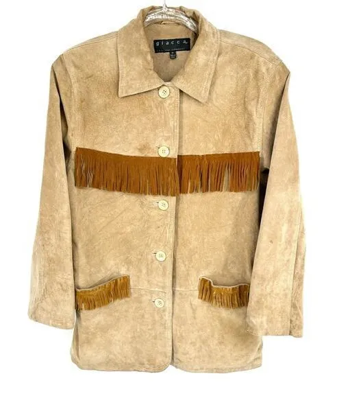 Vintage Giacca Leather Jacket Fringe Size Medium Western 70s style leather mid length jacket with velvet trim detail on front, back, and sleeves Two pockets Button front closure Condition Good overall, some marks on sleeves and bottom of jacket, see all photos Measurements are approx Chest 21" Length 29" All items ship from a pet and smoke free environment Fabric - see photos Fast shipping Country , boho , bohemian , Yellowstone , ranch Southwestern , equestrian , chore , 80s , festival Unique , rare , Nashville Bin - HU
