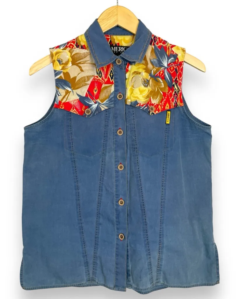 Vintage sleeveless blouse with colorful yoke that also acts as the pocket flaps. Button-up front. Brand: America Perry Ellis Condition: Preloved with fading, small marks, and tearing/repairing on side slits. Size: Medium. See approximate measurements for best fit. Pit to pit: 20" Length: 26" Cleaned and from a smoke-free home. Fast shipper!