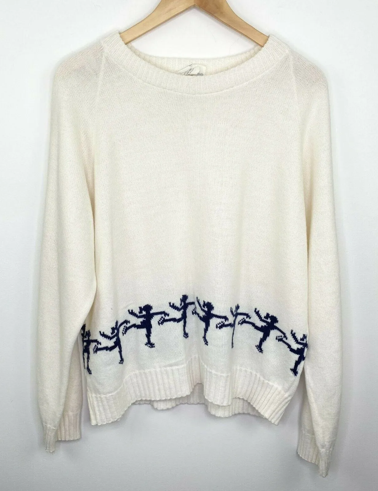White sweater with black ice skater graphic along the hem. Knit construction with ribbed hem, neckline and cuffs. Size: Large (L) Condition: Pre-owned. Has two very small spots on the front (Photo 2 and 3) Approximate Measurements (Flat): Length: 24″ Pit to pit (bust): 22″ Please see photos for more details. Thanks!! #627AE Features: Sweater, Pullover, Knit, Vintage, Fashion, Top, Everyday, Casual, Winter, Warm Vintage White Knit Ice Skater Sweater by Nice Times