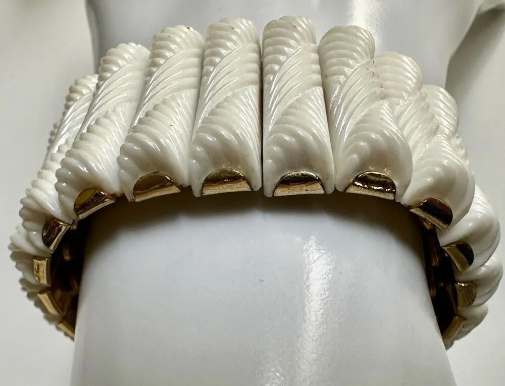 Beautiful 1950s vintage white thermoset gold tone bracelet rope design expansion bracelet... Show more
