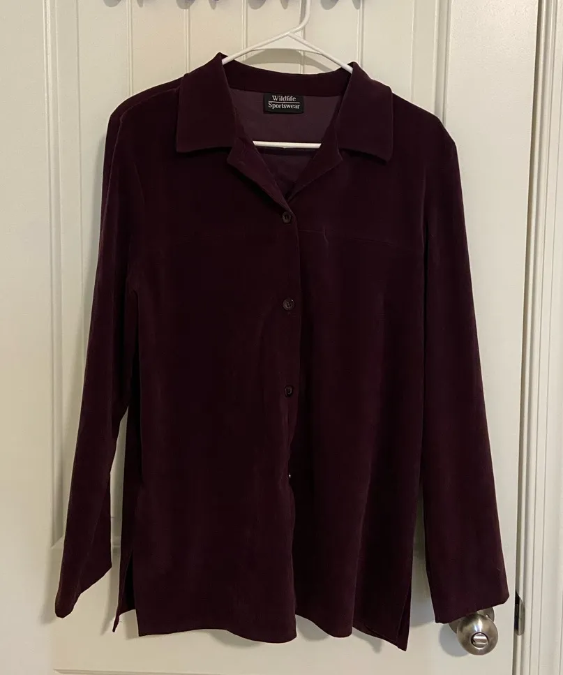 Vintage women’s Wildlife Sportswear shirt. Top is deep purple in color, made of a faux suede material which is so so soft! Has faux pockets on the chest and full front button up. Has removable shoulder pads. Size medium. Smoke free home! Shoulder to shoulder 17 inches, pit to pit 20 inches, sleeve length 17 inches, length 26 inches