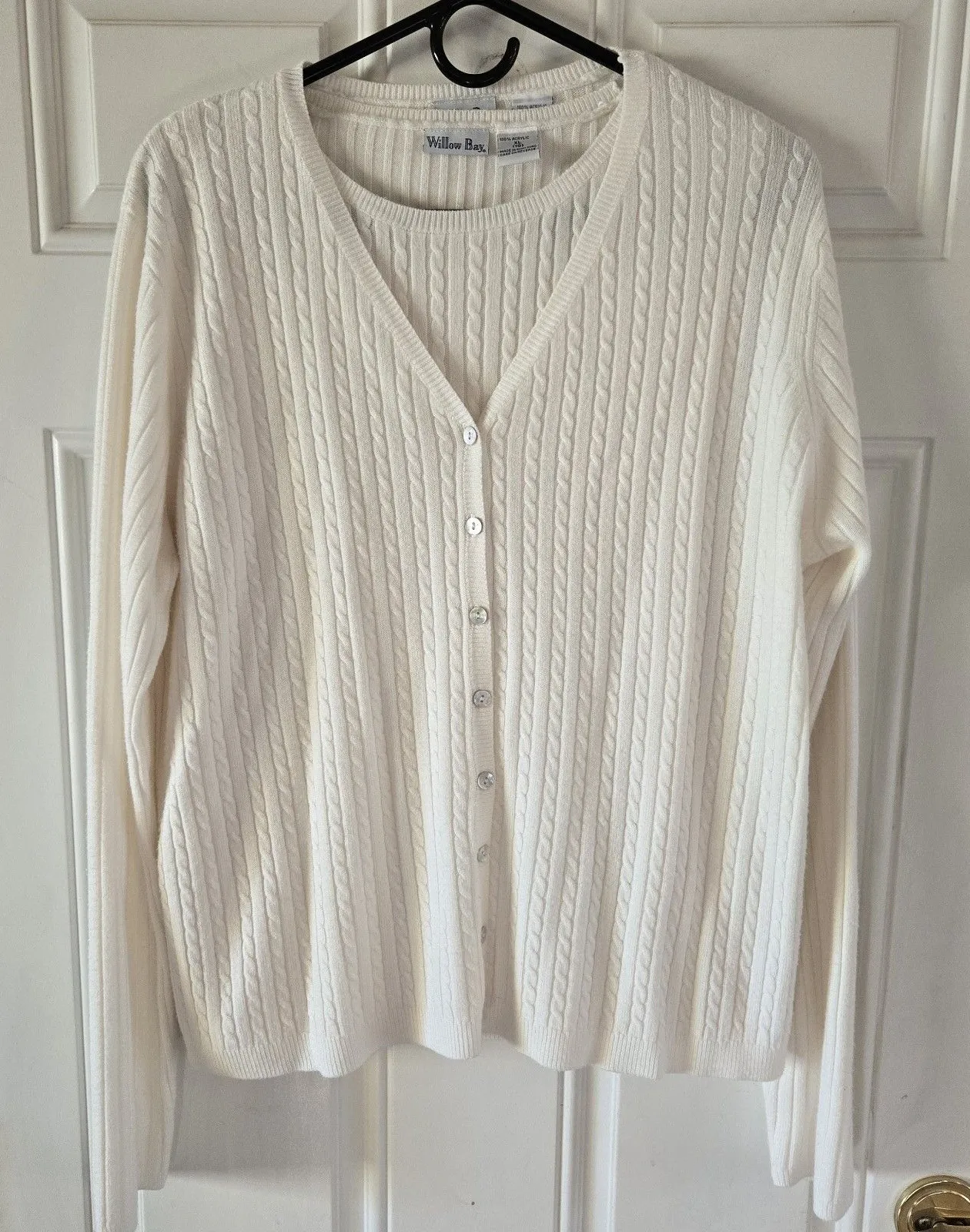 Beautiful vintage Willow Bay two-piece sweater set, featuring a classic white cable knit cardigan and matching sleeveless shell tank. Both pieces are made from 100% acrylic and were made in Hong Kong, a sign of quality craftsmanship from earlier eras. Approximate measurements flat lay: Length of tank top 25" Length of cardigan 25" Pit to pit tank top 19" Pit to pit cardigan 23.5" Details: Brand: Willow Bay Size: XL (18) Color: White / Cream Material: 100% Acrylic Made in Hong Kong Set includes: Button-front cardigan + matching sleeveless tank Condition: Excellent vintage condition no stains, pulls, or holes Style Notes: Timeless and elegant, perfect for a preppy, cottagecore, or classic minimalist look. Wear together as a set or style separately with jeans, trousers, or skirts. Great for layering and transitional weather. Keywords: vintage knit set, 90s cardigan, preppy sweater, cottagecore outfit, Willow Bay top, retro acrylic knit, minimalist neutral outfit