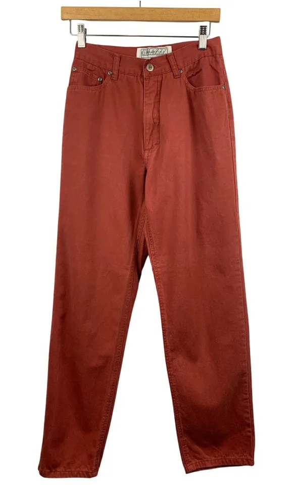 Elevate your wardrobe with these unique rust-colored high-waisted pants from Chazz Credentials by Charles Ghailian, crafted for style and comfort. Their vintage charm and versatile design make them an ideal addition to your collection. The pants offer a blend of quality and fashion, suitable for various occasions and looks. • Features zip fly with button closure • Equipped with front and back pockets • Made from 100% cotton for comfort • Designed in a flattering high-waisted fit Length: 39.5” Inseam: 29” Waist: 13.5” Hip Bust: 18” Ankle: 7” Features: • All season • Hong Kong • See reverse for care Size: 7 Condition: Pre-Owned Like New