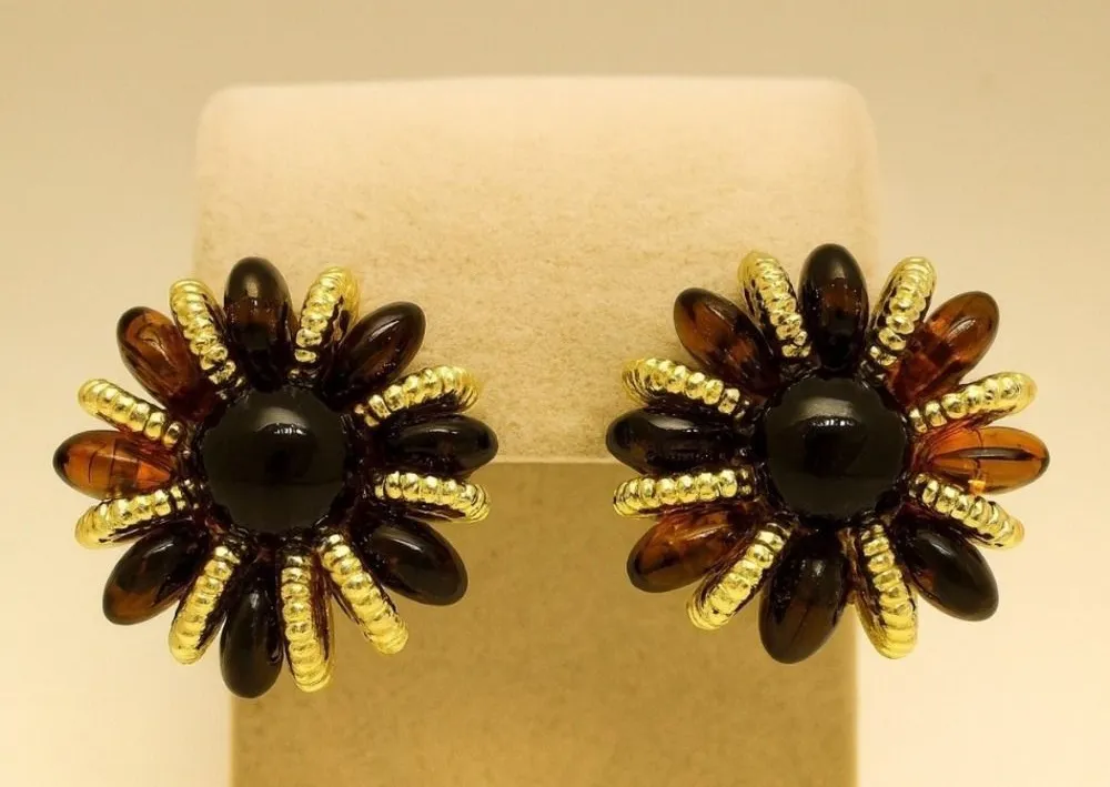 Vintage Womens Chunky Amber Floral Amber Gold Tone Clip On Earrings Retro Chic Great Preowned Condi... Show more