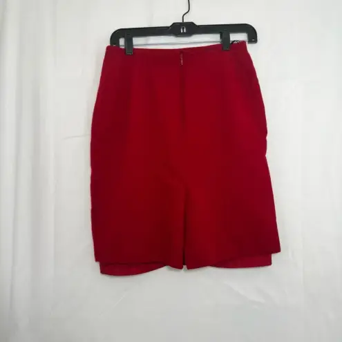 Vintage red skirt by Kasper & Company. It is a size 8 petite and is made of 98% wool and 2% lycra. The skirt has a back zipper closure and is lined with 100% acetate. The skirt is in good condition with no visible imperfections. Back has a subtle slit. Measurements approximate: Waist: 26” Length: 21” Vintage, Vtg, retro, wool, business wear