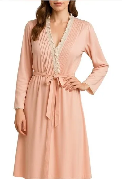 SabriVintage Womens Pink Lace Trimmed Pleated Robe Belted Long Sleeve size medium / large Great Pre... Show more