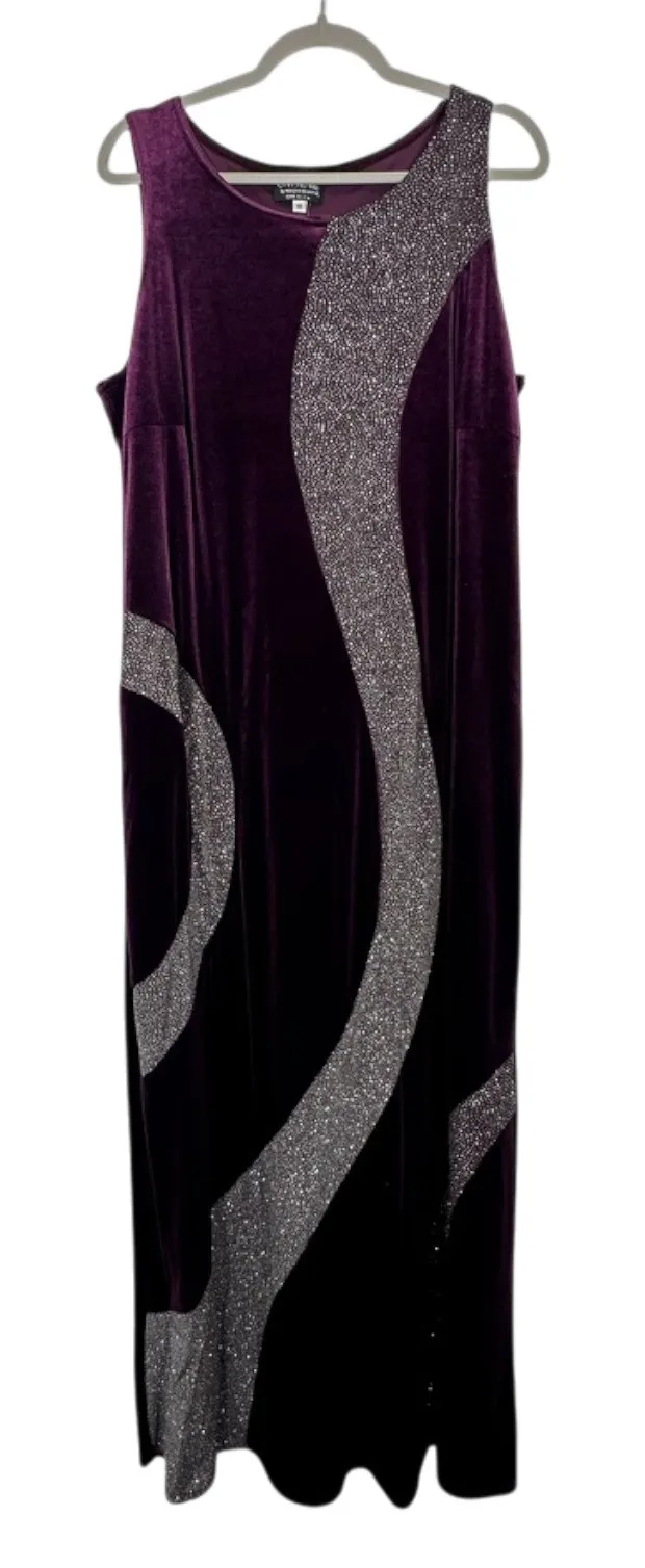 Pre-Owned Vintage in Great Condition Very Stretchy Approximate Measurements: Length: 60" Pit-Pit: 20" Waist Flat Lay: 19" Stunning purple velvet maxi dress captivates with its glamorous design. Flowing curves of sparkling rhinestones cascade down the front, creating a mesmerizing effect that catches the light with every movement. The luxurious velvet fabric drapes beautifully, offering a comfortable and elegant silhouette. Perfect for an evening gala, a sophisticated cocktail party, or a special celebration.