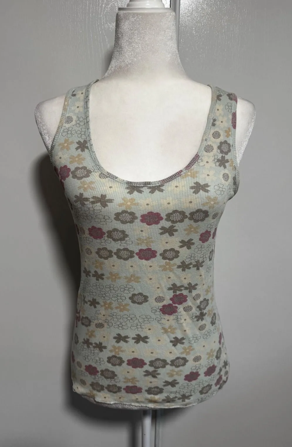 Revel in the charming floral print of this ribbed tank top. Delicate blooms in soft pink, yellow, and taupe are scattered across a light blue ribbed background, creating a whimsical and feminine aesthetic. The comfortable ribbed fabric offers a flattering fit, perfect for layering or wearing on its own. Ideal for a casual day out, a garden party, or a relaxed vacation. Type: Tank Department: Women Style: Basic Material: 100% Cotton Neckline: Scoop Neck Sleeve Length: Sleeveless Sleeve Type: Strappy Sleeve Pattern: Floral Features: Straps Fit: Slim Keywords: ribbed tank, floral print, light blue, pink flowers, yellow flowers, women's top, casual wear, summer fashion, layering piece, feminine style, garden party, vacation outfit, boho chic