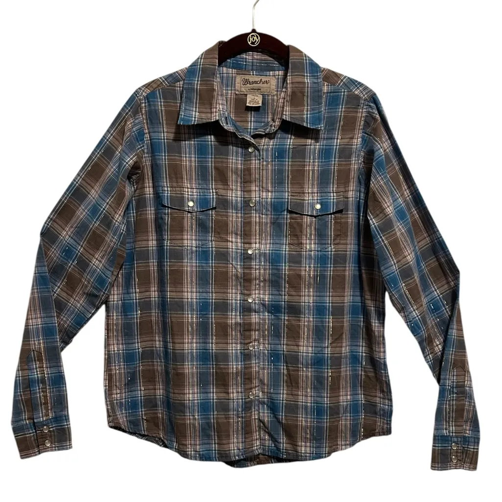 Size:Large PTP: 22.5” Vintage Western Women’s Wrangler Long Sleeve Pearl Snap Shirt Gold metallic pl... Show more