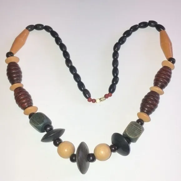 Vintage Wooden Beaded Black Brown Tan Green Chunky Retro Necklace - $27 - From Vault