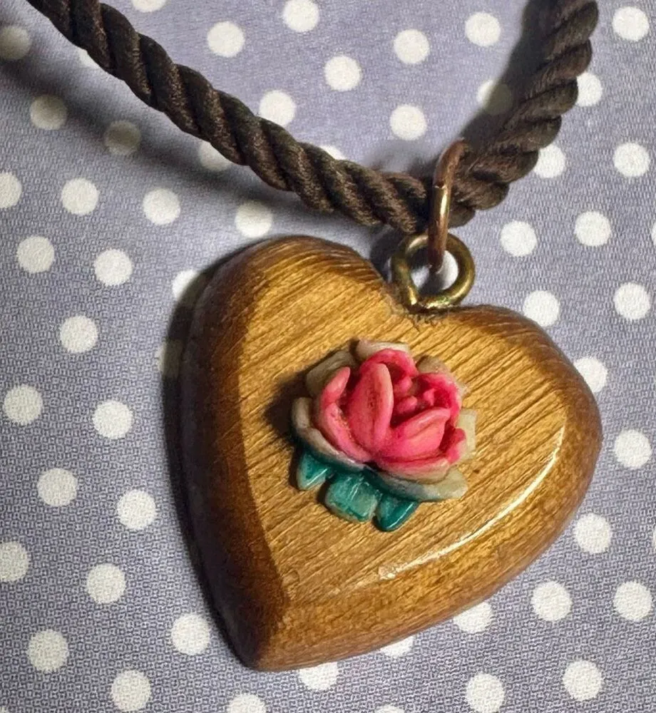 Vintage Wooden flower heart pendant necklace on cord sterling silver clasp Pink - $18 - From Rebecca