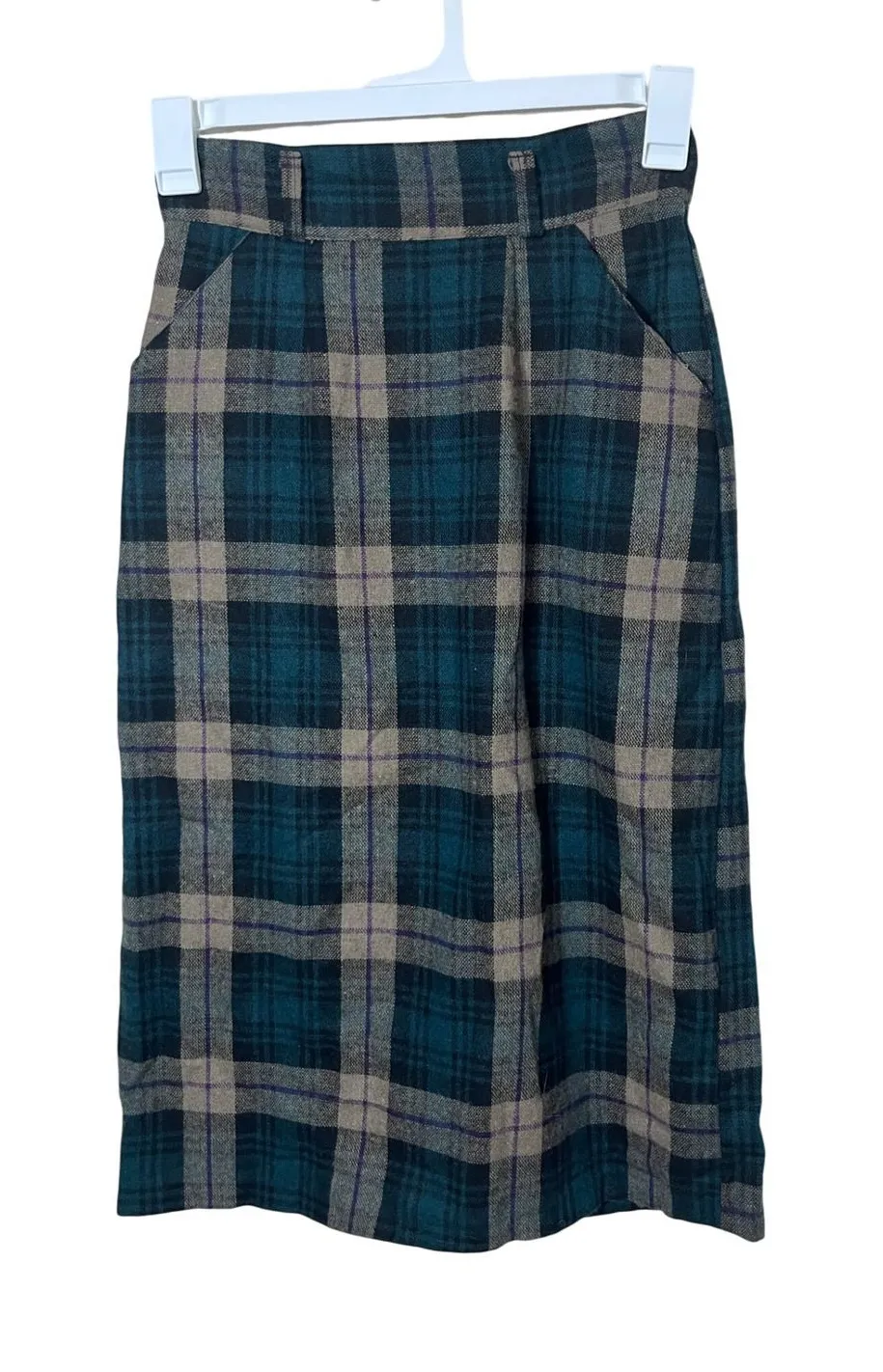 High-waisted midi skirt featuring a classic plaid pattern. This skirt boasts a tailored silhouette with functional pockets and a unique buttoned front slit. Colors include shades of teal, grey, and purple. Type: Skirt Style: Straight & Pencil Skirt Length: Midi Department: Women Pattern: Plaid Material: Wool, Polyester, Rayon Accents: Button Fabric Type: Tweed Features: Pockets, Slit Theme: Retro Closure: Button Rise: High Occasion: Casual, Workwear, Business Keywords: plaid, vintage, career, retro, !!!Please See Measurements vintage sizes run smaller than modern sizes!!! Measurements Length: 29 inches Waist: 14 inches Hips: 18 inches