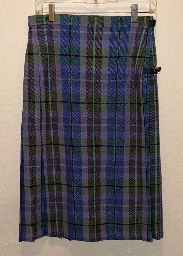 Stylish vintage plaid pleated skirt featuring a blend of purple and green hues. Perfect for adding a touch of elegance to your wardrobe. Modest length, wrap skirt. Measurements are approximate One small hole near paintbrush- see pictures No material tag, feels like wool.