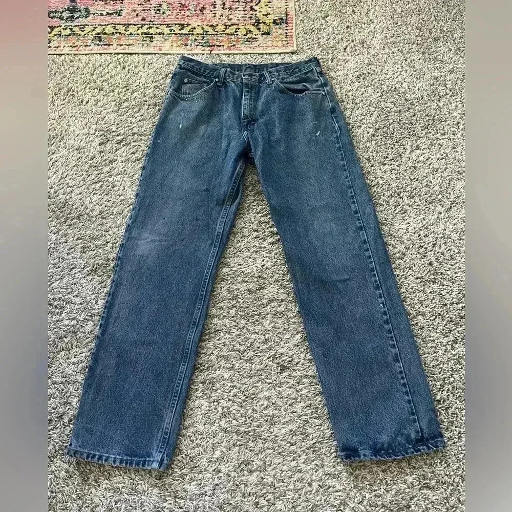 Medium wash in color Distressing all over jeans- paint splatter, distressing on cuffs, worn look on... Show more