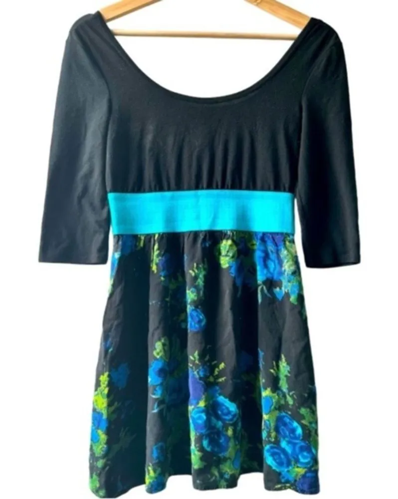 Vintage Xhilaration baby doll black bodice/floral skirt mini dress, size small found in good condition. Turquoise empire elastic waist. Bodice is a soft cotton, skirt is lightweight like rayon. This is so comfy with cropped tights and flats.
