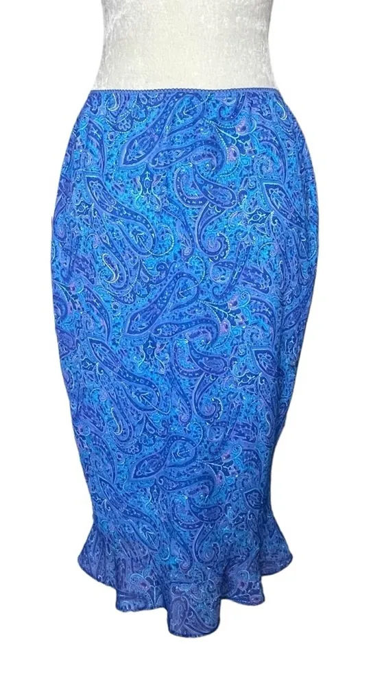 Blue color with paisley print Ruffle detail at hem Pull on Elastic waistband Lined Figure flattering Pre-owned in very good vintage condition Size L Approximate measurements Waist 13.5” Hip 19” Length 27” -C6 -8.