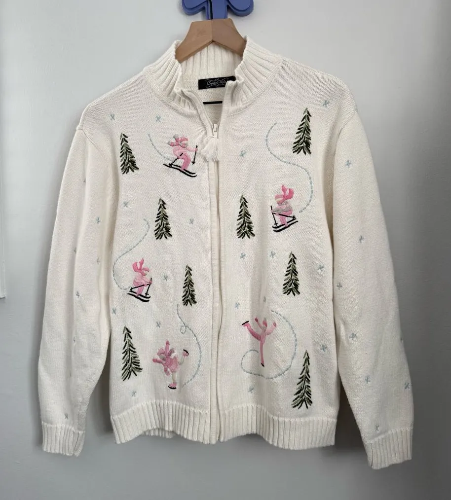 Vintage XL Ski Embroidered Full Zip Knit Cardigan Ivory Cabin Aspen Winter White - $34 - From Most