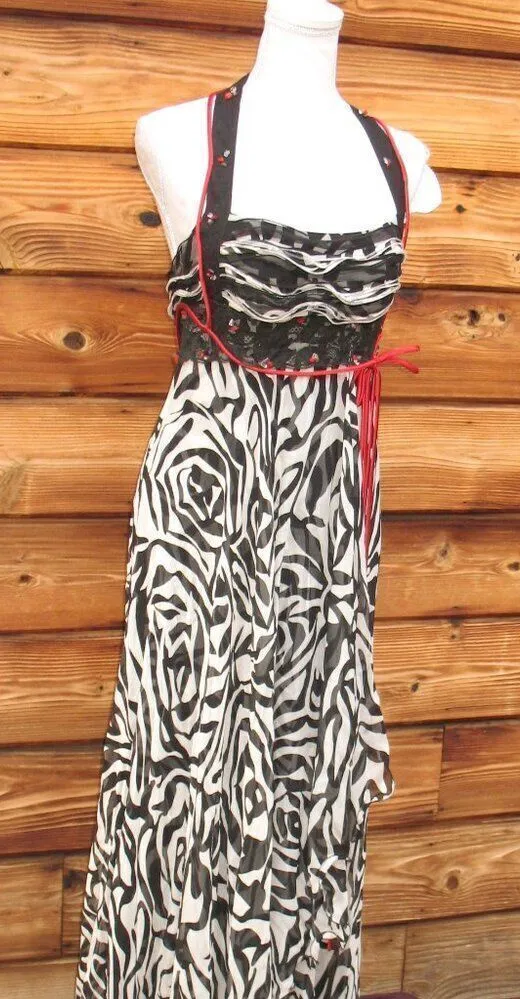 *Excellent condition. No flaws. Details: Alberto Makali Size: 6 Color: Black/White/Red Side zip closure Halter neckline with beaded detail Ruffle bust line with ribbon Lined Maxi Length 100% Silk chiffon Approximate Measurements: Length from bust: 52" Underarm to underarm: 17" Across waist: 14" Party Silk Print Wedding Lace Flowy Vintage Y2K 90's