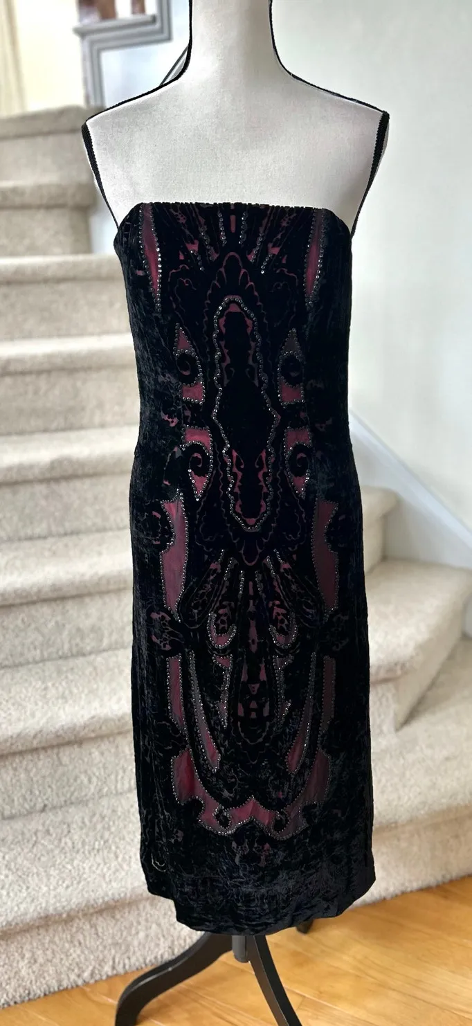 Very good condition, missing top hook by zipper, doesn't affect wear. Black crushed velvet with illusion panels that let the red lining peak through. Strapless, mid length, sheath. Back zipper. Damask pattern with sequins for sparkle. Size 4 pit to pit 15 inches bust to hem 40 inches waist flat 13 inches hips flat 17.5 inches rayon/silk witchy, vampire, dark romance, whimsigoth, goth