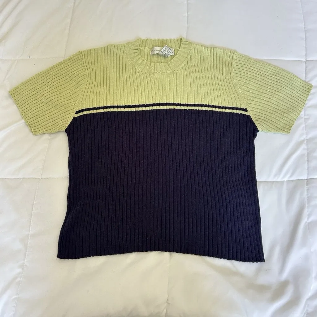 This vintage Y2K 90s women's large blue green cable ribbed round neck t-shirt sweater is a stylish and unique addition to any wardrobe. Excellent condition! Please see measurements, fits more like a small. Tags: Y2K, vintage, 90s, retro, 80s, grandmacore, grandpacore