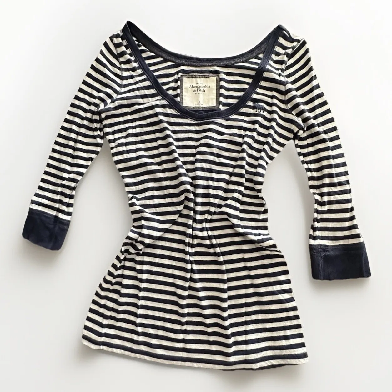 * Authentic vintage Y2K era piece * Scoop neck silhouette * Navy blue & gray striped pattern * Lo... Show more