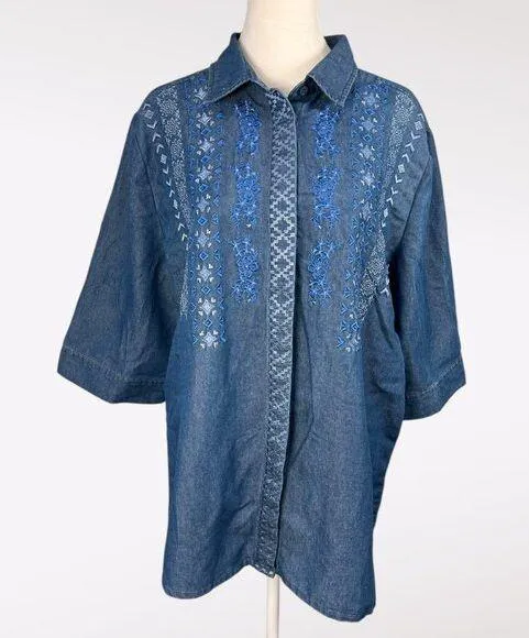 Lightweight chambray denim shirt with vivid blue embroidery on the front and relaxed half sleeves gi... Show more