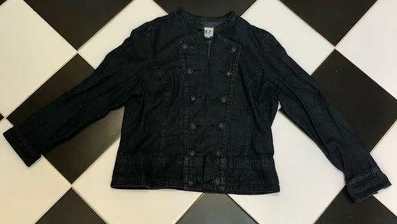 Long sleeve military style double button blazer jacket Hook & eye closures down the front, doesn’t completely close, buttons are faux Hook & eye closures are pretty study metal, not the typical ones you see on dresses Denim jean jacket Slightly stretchy 100% cotton RN 63963 Approx measurements laying flat Pit to pit 22” Length 23.5” Excellent used condition Freshly laundered Smoke free home Chore coat 90s y2k