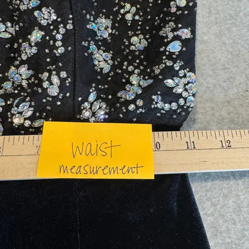 Captivate every room in this stunning B. Darlin formal gown. The luxurious black velvet drapes beautifully, creating an elegant silhouette that is both timeless and alluring. Intricate beading adorns the sheer halter neckline, sparkling with iridescent jewels that catch the light with every movement. A daring keyhole cutout at the front and a dramatic open back with crisscross straps add a touch of modern glamour, while the floor-length skirt ensures a sophisticated finish. Perfect for galas, proms, weddings, or any special evening event where you want to make an unforgettable impression.