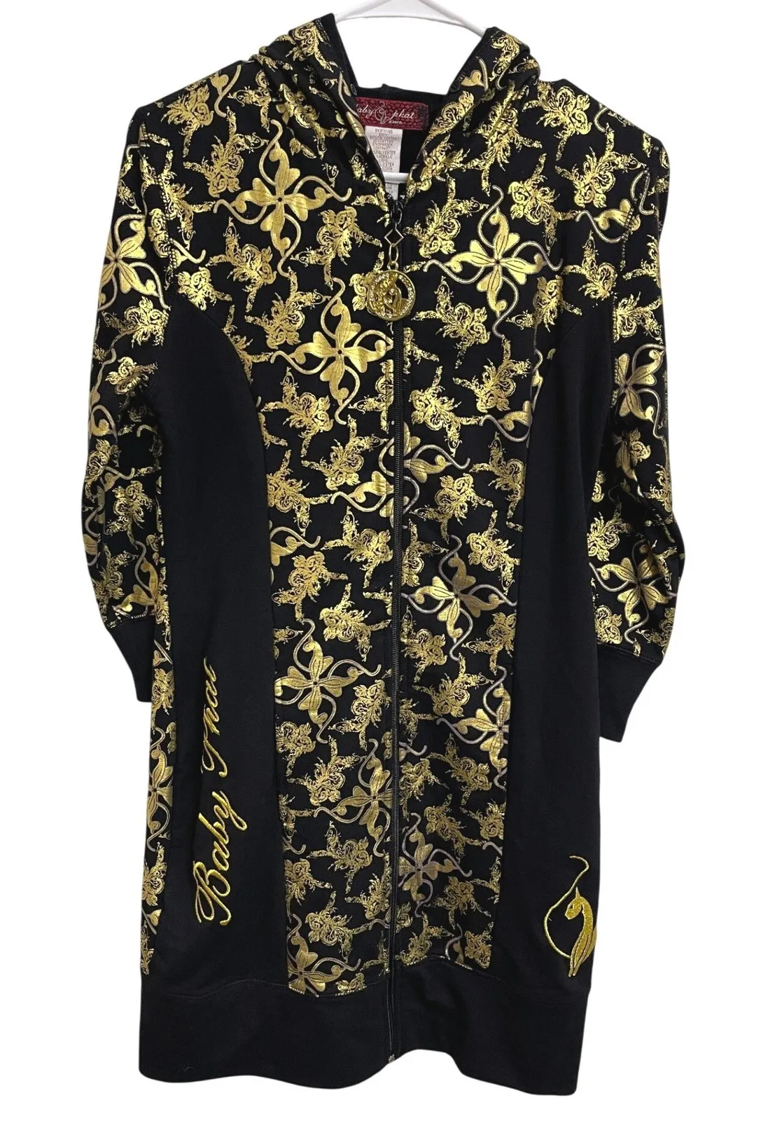 Keywords: Baby Phat Hoodie, Gold Print, Athletic Wear, Streetwear, Y2K Fashion, Comfortable, Casual, Loungewear, Designer, Graphic Hoodie, Fashionable Flaws: None Pit to Pit: 19in Length: 34in Tagged as a large but fits more like a medium