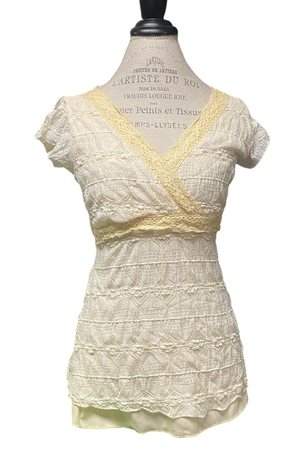 Preloved with discoloration at the back. Please see last photo. Type: Blouse Department: Women Neckline: V-Neck Sleeve Length: Short Sleeve Accents: Crochet, Ruffle Theme: Classic Features: lined Fit: Slim Fabric Type: Lace Occasion: Casual, Party/Cocktail Closure: Tie Keywords: sheer, lace, wrap, vneck, short sleeve, tie waist, boho, feminine, romantic, lightweight, delicate, charming, evening, garden party, picnic