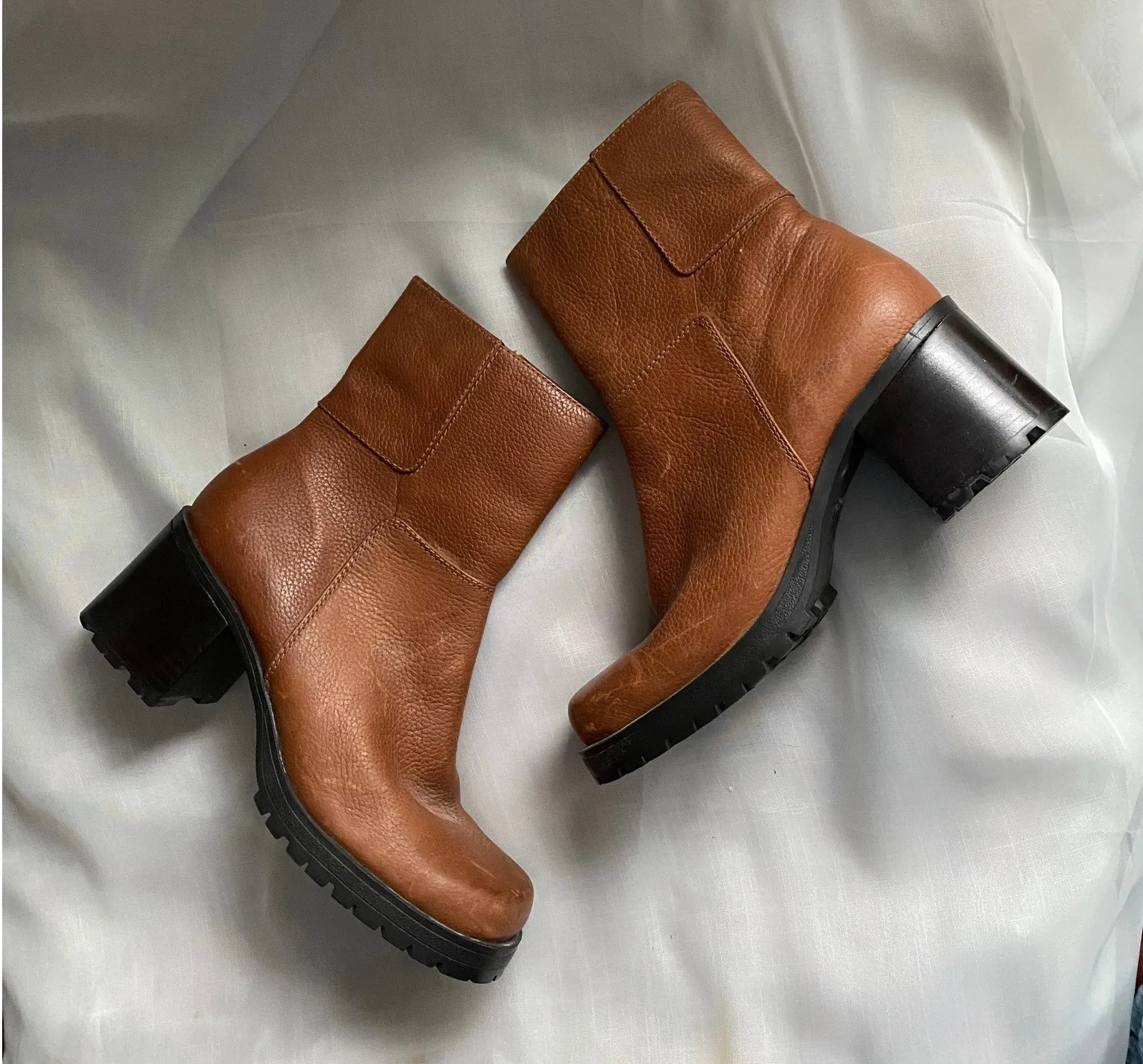 Bass tan leather ankle boots with a chunky block heel, square toe, and lug sole. Features a side zipper for easy on and off and genuine leather construction. In good vintage condition, lightly scuffed as seen in pics. Style: Bootie Department: Women Upper Material: Leather UK Shoe Size: 5.5 AU Shoe Size: 7.5 Shoe Shaft Style: Ankle Insole Material: Leather Outsole Material: Rubber Heel Style: Block Heel Height: High (3-3.9 in) Occasion: Casual, Workwear Toe Shape: Square Toe EU Shoe Size: 39 Type: Boot western, cowgirl, gilmore girls, fall, bootie, 2004, phoebe buffay, cherry girl, bohemian, boho, leather boots, chunky heel, lug sole, ankle boots, block heel, frye campus, square toe, side zip, women's fashion, fall fashion, winter boots, casual boots, moto boots, street style