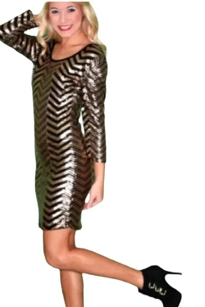 This fun and fabulous dress is perfect for a night out, party or club, bachelorette party, Las Vegas ,valentines or galentines . cute cut out back detail . Black and gold sequin chevron pattern . Fitted mini dress.i new year’s eve