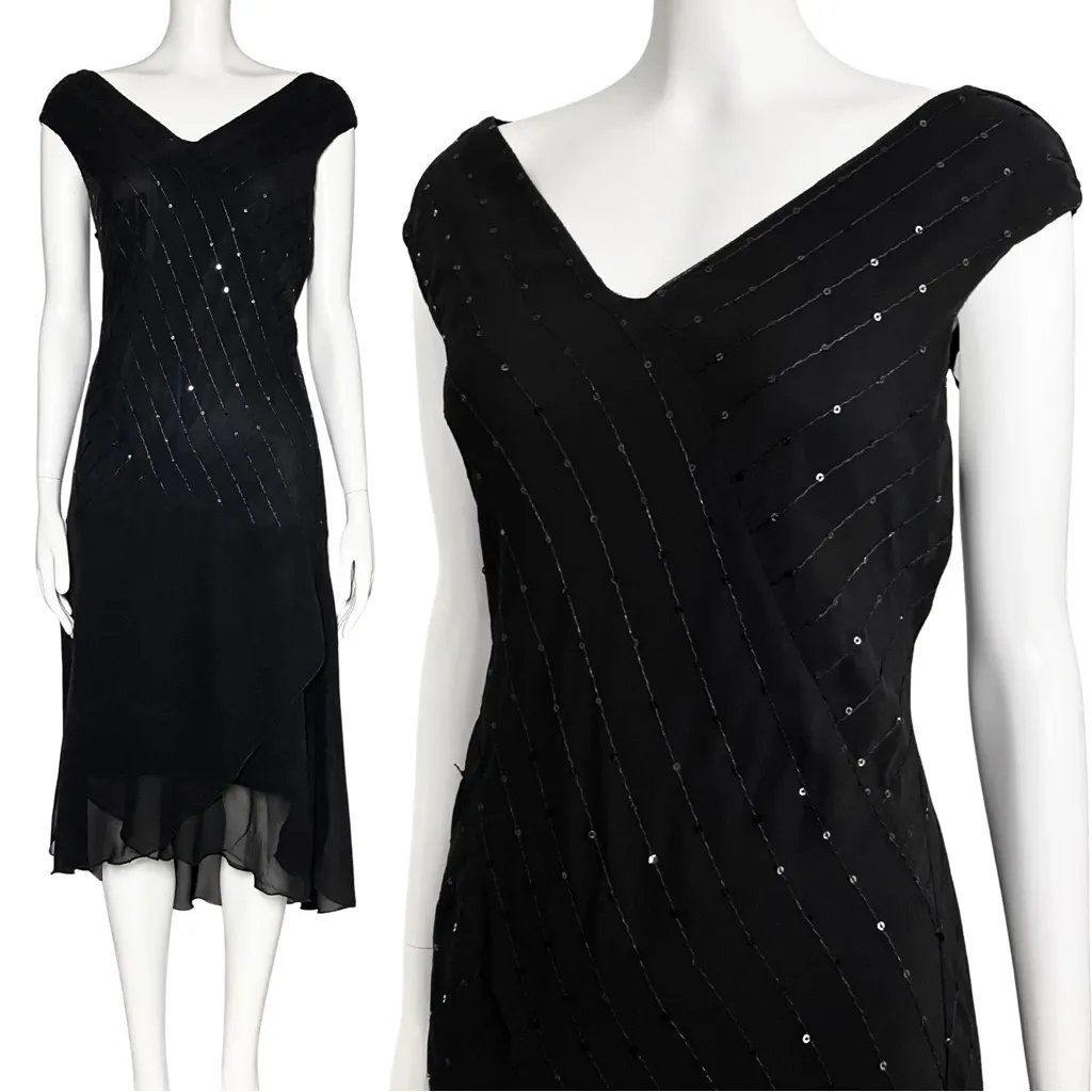 Black chiffon party dress with sequin diagonal and an asymmetrical midi hem by Connected Apparel fro... Show more
