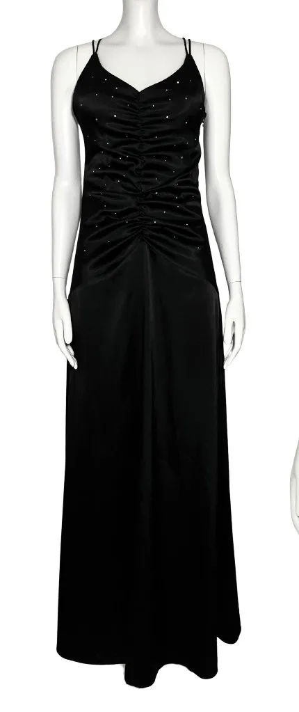 Black satin long formal evening gown with crossback straps, rhinestones and ruching through the bodice, and a trumpet to sheath silhouette by Fiesta from the late 90s or very early 00s. Made in the USA! Formal black dress with a v neckline and low back with scattered rhinestones on the bodice and crossback thin straps. Ruching from the neckline to the hips on the front and back create a super figure flattering effect. The skirt, starting at the hips, turns into a free-flowing sheath silhouette. Glamorous dress with a retro flair that is perfect for prom or a similar formal event. In very good vintage condition due to one small, faint mark on the skirt and wear to the hem as pictured. Not noticeable when wearing. Zipper works but can be slightly hard to close. Tagged size small but would fit a modern xs. Double check your measurements below for the perfect fit. Bra padding has been added as pictured but can be seam ripped out if desired. Approximate measurements when laid flat: Pit to Pit: 15β Waist: 13β Hip: 17.25β Length: 58.5β (shoulder to hem) 96% Polyester, 4% Spandex 100% Acetate Lining Dry Clean Only prom dress, formal, long, maxi, evening gown, black, satin, trumpet, ruched, fit and flare, rhinestones, 90s, y2k, retro, glam, slip dress, sexy, bodycon, gothic glam, fairy grunge