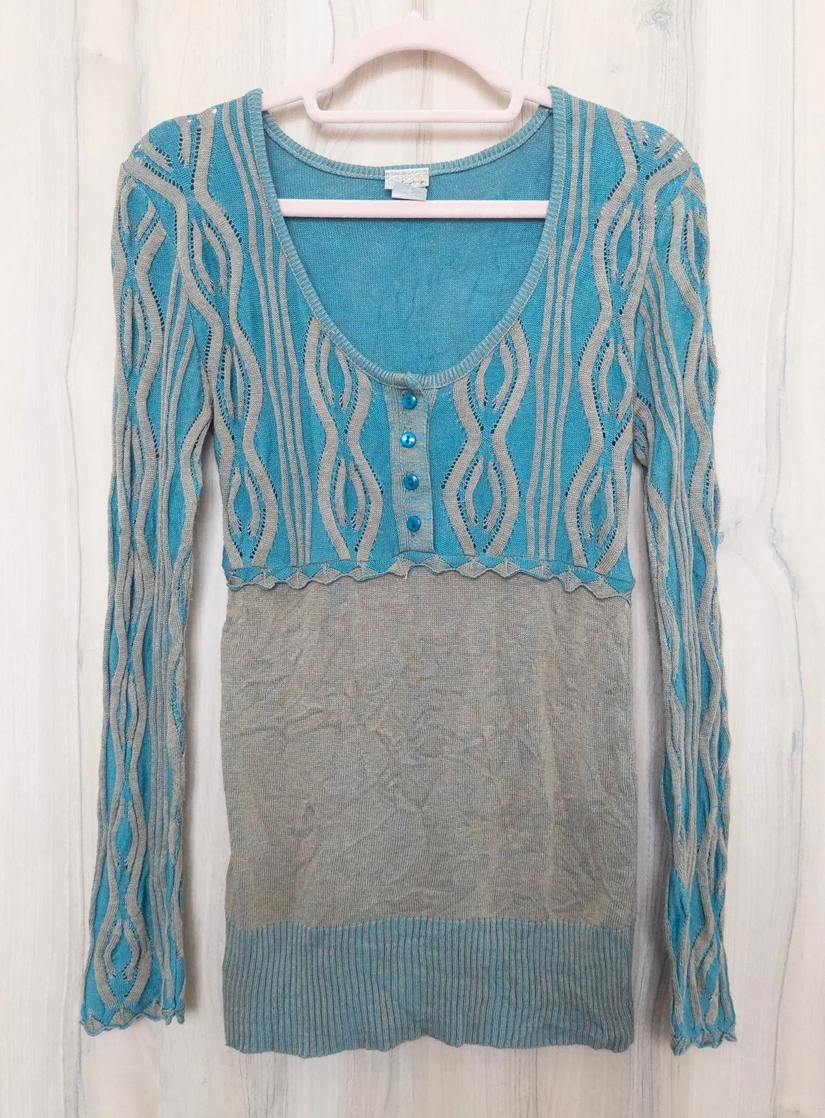 A stylish blue and gray knit tunic top for women. This long-sleeved top features an intricate cable... Show more